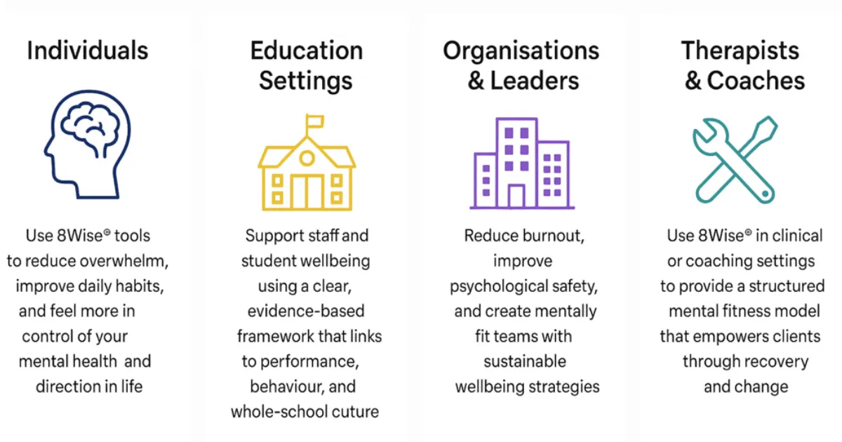 Your mental health and wellbeing aren’t just about “coping”, they’re about thriving. The 8Wise® Method gives you a clear, structured way to understand and improve your mental fitness across every area of life.